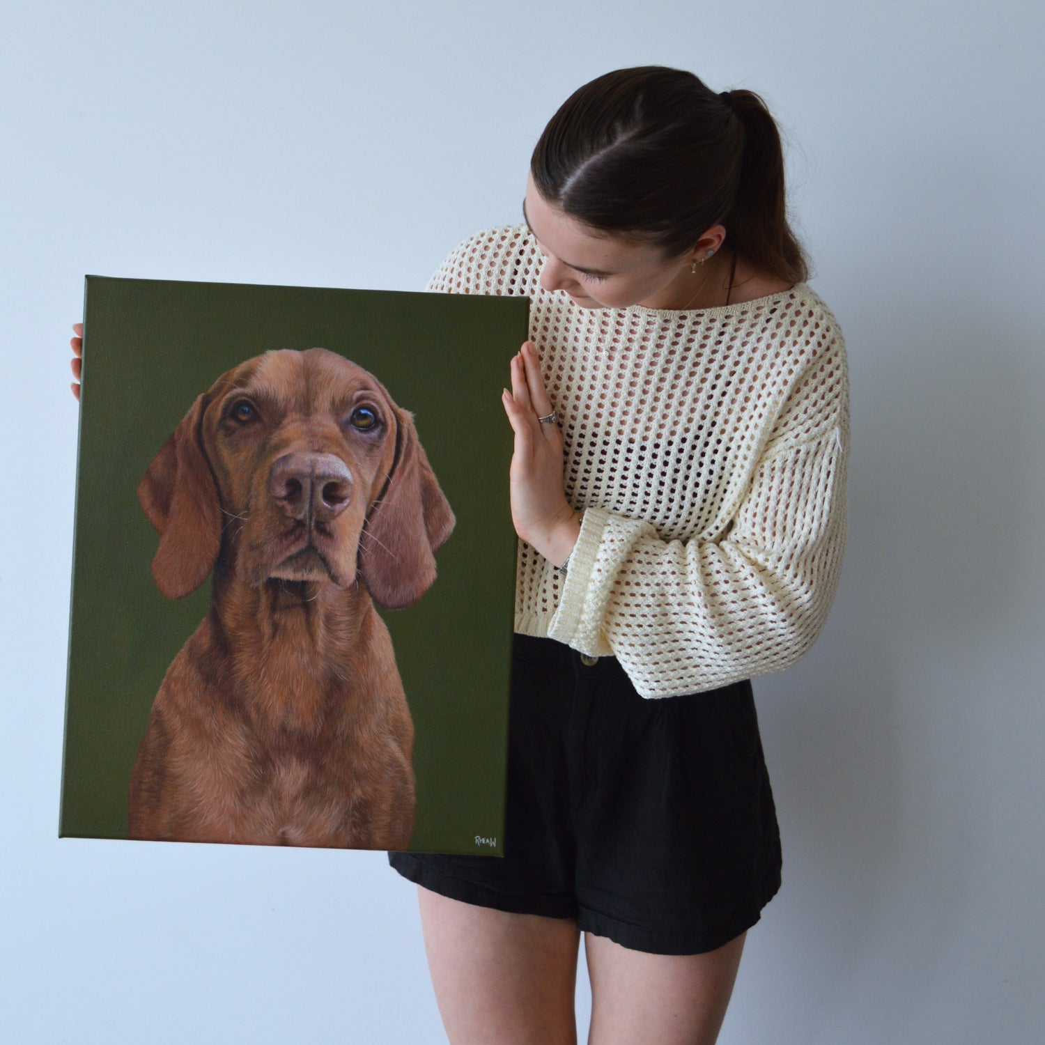 To speed the process up, you can send me any photos you would be interested in having painted, a canvas size from above/ a bespoke size and any additional details you are wanting (background detail, no collar/ harness etc.).